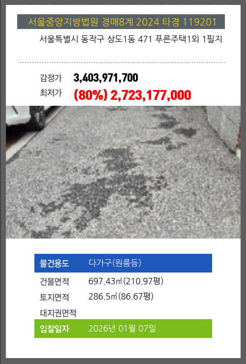 사건번호 2024 타경 119201 본건은 서울특별시 동작구 상도1동 471 푸른주택1외 1필지소재하는 다가구(원룸등)경매 물건의 포스팅입니다. 건물면적 [ 697.43㎡ (210.97평) ]토지면적 [ 286.5㎡ (86.67평) ] 시세를 반영한
