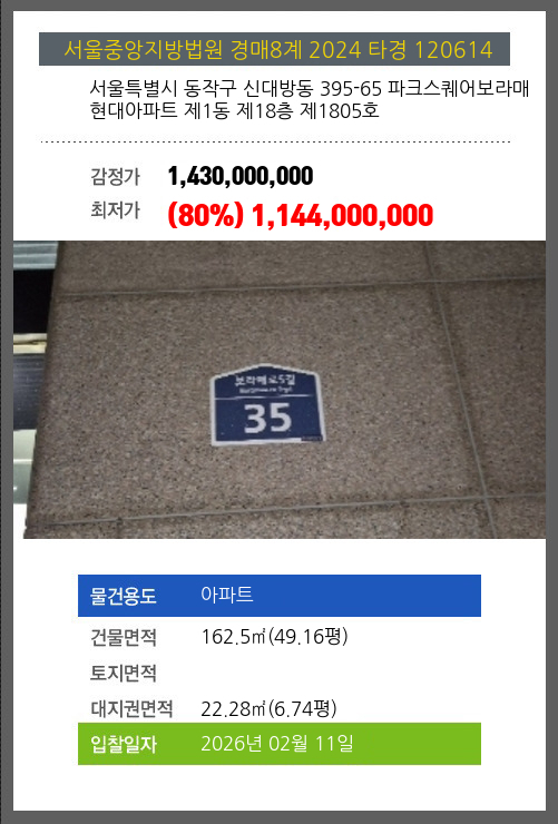 사건번호 2024 타경 120614 본건은 서울특별시 동작구 신대방동 395-65 파크스퀘어보라매현대아파트 제1동 제18층 제1805호소재하는 아파트경매 물건의 포스팅입니다. 건물면적 [ 162.5㎡ (49.16평) ]대지권 [ 22.28㎡ (6.74평) ]