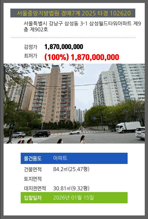 사건번호 2025 타경 102620 본건은 서울특별시 강남구 삼성동 3-1 삼성월드타워아파트 제9층 제902호소재하는 아파트경매 물건의 포스팅입니다. 건물면적 [ 84.2㎡ (25.47평) ]대지권 [ 30.81㎡ (9.32평) ] 시세를