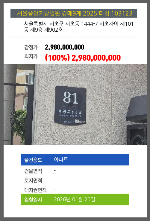 사건번호 2025 타경 103123 본건은 서울특별시 서초구 서초동 1444-7 서초자이 제101동 제9층 제902호소재하는 아파트경매 물건의 포스팅입니다. 시세를 반영한 감정가 2,980,000,000에서신건으로 감정가 대비 100%최저가 2,980,000,000부터입찰에 참여할