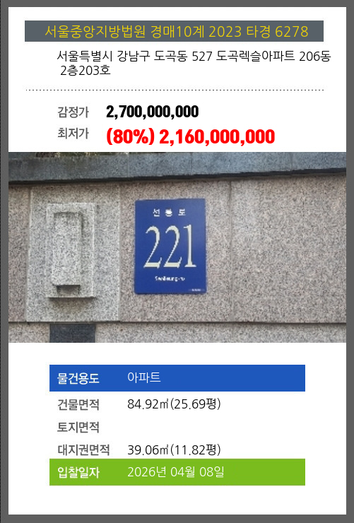 사건번호 2023 타경 6278 본건은 서울특별시 강남구 도곡동 527 도곡렉슬아파트 206동 2층203호소재하는 아파트경매 물건의 포스팅입니다. 건물면적 [ 84.92㎡ (25.69평) ]대지권 [ 39.06㎡ (11.82평) ] 시세를