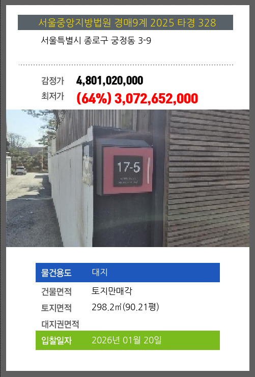사건번호 2025 타경 328 본건은 서울특별시 종로구 궁정동 3-9소재하는 대지경매 물건의 포스팅입니다. 건물면적 [ 토지만매각 ]토지면적 [ 298.2㎡ (90.21평) ] 시세를 반영한 감정가 4,801,020,000에서2회 유찰되어