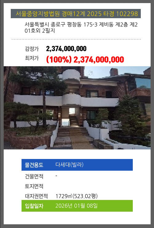 사건번호 2025 타경 102298 본건은 서울특별시 종로구 평창동 175-3 제비동 제2층 제201호외 2필지소재하는 다세대(빌라)경매 물건의 포스팅입니다. 대지권 [ 1729㎡ (523.02평) ] 시세를 반영한 감정가 2,374,000,000에서신건으로