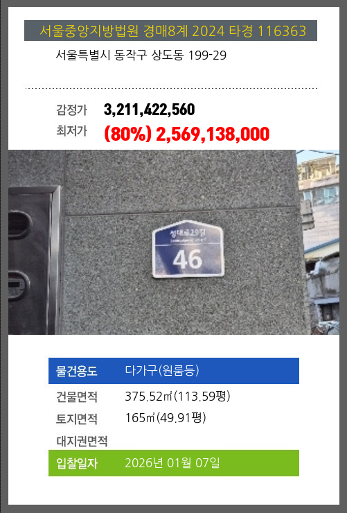 사건번호 2024 타경 116363 본건은 서울특별시 동작구 상도동 199-29소재하는 다가구(원룸등)경매 물건의 포스팅입니다. 건물면적 [ 375.52㎡ (113.59평) ]토지면적 [ 165㎡ (49.91평) ] 시세를 반영한 감정가 3,211,422,560에서1회
