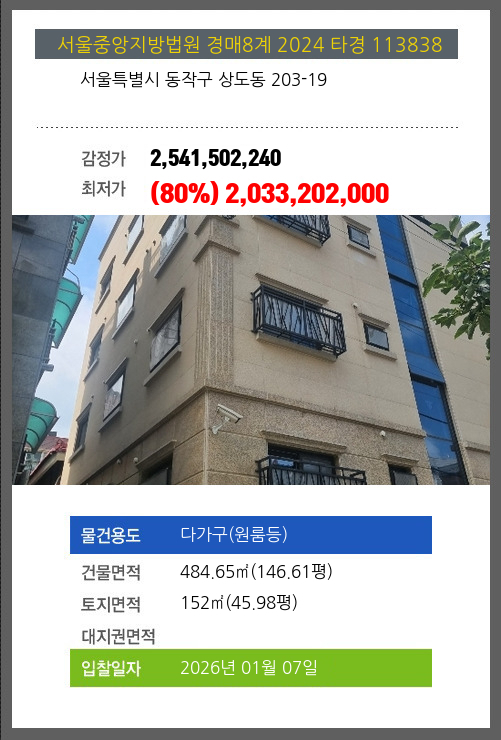 사건번호 2024 타경 113838 본건은 서울특별시 동작구 상도동 203-19소재하는 다가구(원룸등)경매 물건의 포스팅입니다. 건물면적 [ 484.65㎡ (146.61평) ]토지면적 [ 152㎡ (45.98평) ] 시세를 반영한 감정가 2,541,502,240에서1회