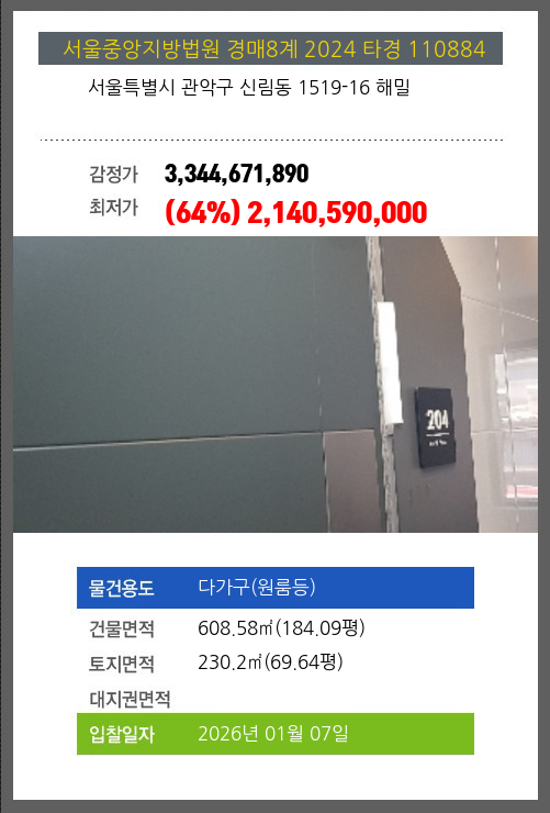 사건번호 2024 타경 110884 본건은 서울특별시 관악구 신림동 1519-16 해밀소재하는 다가구(원룸등)경매 물건의 포스팅입니다. 건물면적 [ 608.58㎡ (184.09평) ]토지면적 [ 230.2㎡ (69.64평) ] 시세를 반영한 감정가