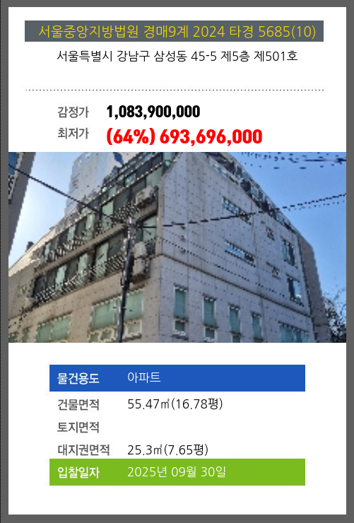 사건번호 2024 타경 5685(10) 본건은 서울특별시 강남구 삼성동 45-5 제5층 제501호소재하는 아파트경매 물건의 포스팅입니다. 건물면적 [ 55.47㎡ (16.78평) ]대지권 [ 25.3㎡ (7.65평) ] 시세를 반영한
