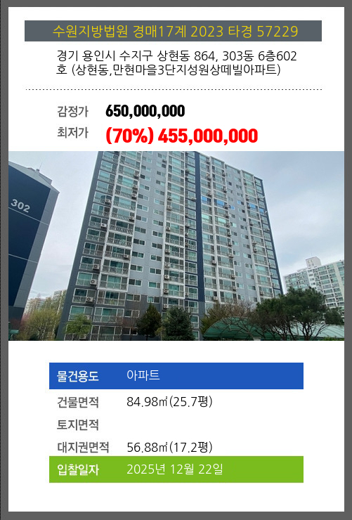 사건번호 2023 타경 57229 본건은 경기 용인시 수지구 상현동 864, 303동 6층602호 (상현동,만현마을3단지성원상떼빌아파트)소재하는 아파트경매 물건의 포스팅입니다. 건물면적 [ 84.98㎡ (25.7평) ]대지권 [ 56.88㎡ (17.2평) ]