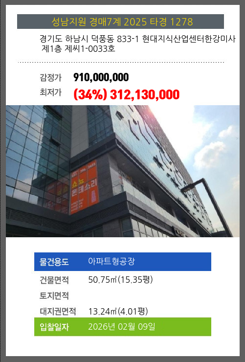 사건번호 2025 타경 1278 본건은 경기도 하남시 덕풍동 833-1 현대지식산업센터한강미사 제1층 제씨1-0033호소재하는 아파트형공장경매 물건의 포스팅입니다. 건물면적 [ 50.75㎡ (15.35평) ]대지권 [ 13.24㎡ (4.01평) ] 시세를