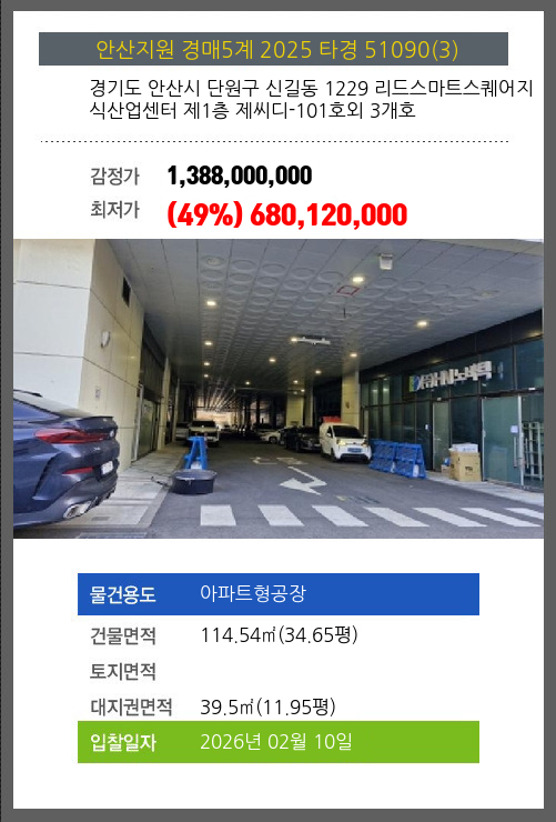 사건번호 2025 타경 51090(3) 본건은 경기도 안산시 단원구 신길동 1229 리드스마트스퀘어지식산업센터 제1층 제씨디-101호외 3개호소재하는 아파트형공장경매 물건의 포스팅입니다. 건물면적 [ 114.54㎡ (34.65평) ]대지권 [ 39.5㎡ (11.95평)
