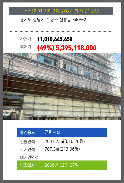 사건번호 2024 타경 71522 본건은 경기도 성남시 수정구 신흥동 3405-2소재하는 근린시설경매 물건의 포스팅입니다. 건물면적 [ 2037.23㎡ (616.26평) ]토지면적 [ 707.3㎡ (213.96평) ] 시세를 반영한 감정가