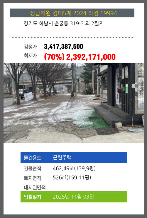 사건번호 2024 타경 69994 본건은 경기도 하남시 춘궁동 319-3 외 2필지소재하는 근린주택경매 물건의 포스팅입니다. 건물면적 [ 462.49㎡ (139.9평) ]토지면적 [ 526㎡ (159.11평) ] 시세를 반영한