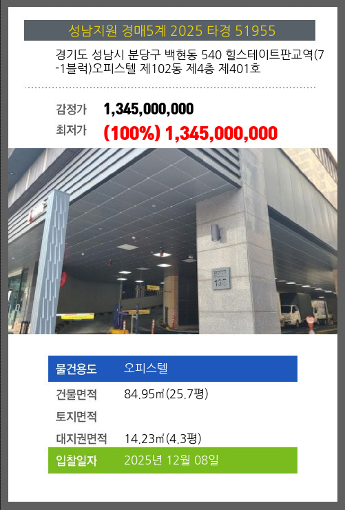 사건번호 2025 타경 51955 본건은 경기도 성남시 분당구 백현동 540 힐스테이트판교역(7-1블럭)오피스텔 제102동 제4층 제401호소재하는 오피스텔경매 물건의 포스팅입니다. 건물면적 [ 84.95㎡ (25.7평) ]대지권 [ 14.23㎡ (4.3평)