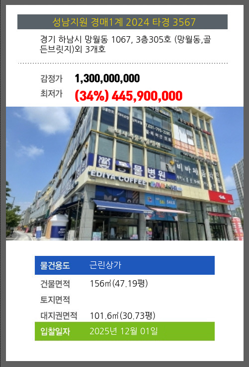 사건번호 2024 타경 3567 본건은 경기 하남시 망월동 1067, 3층305호 (망월동,골든브릿지)외 3개호소재하는 근린상가경매 물건의 포스팅입니다. 건물면적 [ 156㎡ (47.19평) ]대지권 [ 101.6㎡ (30.73평) ] 시세를