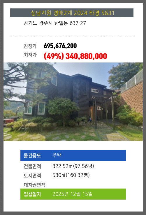 사건번호 2024 타경 5631 본건은 경기도 광주시 탄벌동 637-27소재하는 주택경매 물건의 포스팅입니다. 건물면적 [ 322.52㎡ (97.56평) ]토지면적 [ 530㎡ (160.32평) ] 시세를 반영한 감정가 695,674,200에서2회