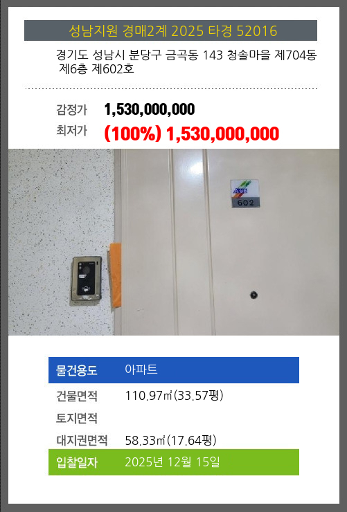 사건번호 2025 타경 52016 본건은 경기도 성남시 분당구 금곡동 143 청솔마을 제704동 제6층 제602호소재하는 아파트경매 물건의 포스팅입니다. 건물면적 [ 110.97㎡ (33.57평) ]대지권 [ 58.33㎡ (17.64평)