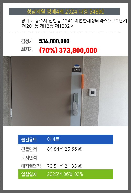 사건번호 2024 타경 54800 본건은 경기도 광주시 신현동 1241 이편한세상테라스오포2단지 제201동 제12층 제1202호소재하는 아파트경매 물건의 포스팅입니다. 건물면적 [ 84.84㎡ (25.66평) ]대지권 [ 70.51㎡ (21.33평) ]