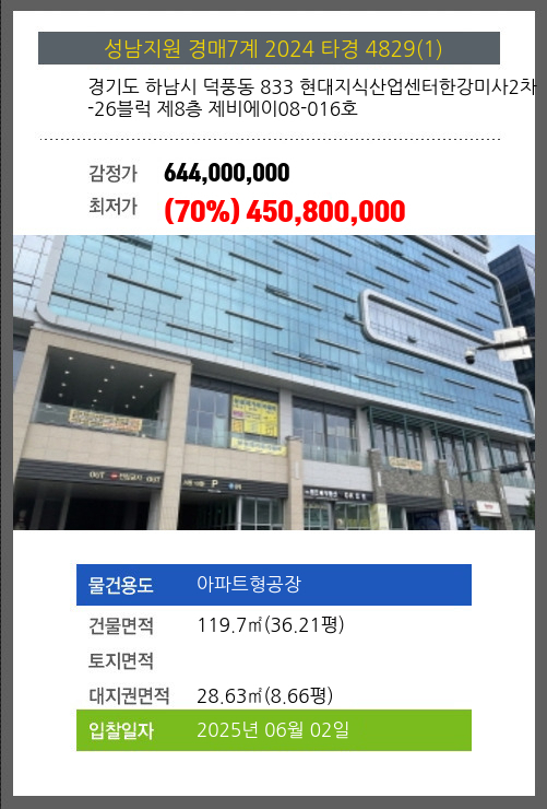 사건번호 2024 타경 4829(2) 본건은 경기도 하남시 덕풍동 833 현대지식산업센터한강미사2차-26블럭 제8층 제비에이08-017호소재하는 아파트형공장경매 물건의 포스팅입니다. 건물면적 [ 119.7㎡ (36.21평) ]대지권 [ 28.63㎡ (8.66평) ] 시세를