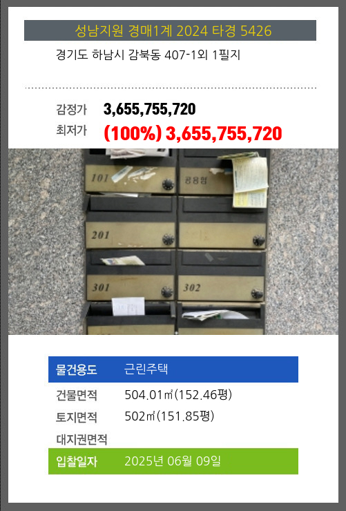 사건번호 2024 타경 5426 본건은 경기도 하남시 감북동 407-1외 1필지소재하는 근린주택경매 물건의 포스팅입니다. 건물면적 [ 504.01㎡ (152.46평) ]토지면적 [ 502㎡ (151.85평) ] 시세를 반영한 감정가