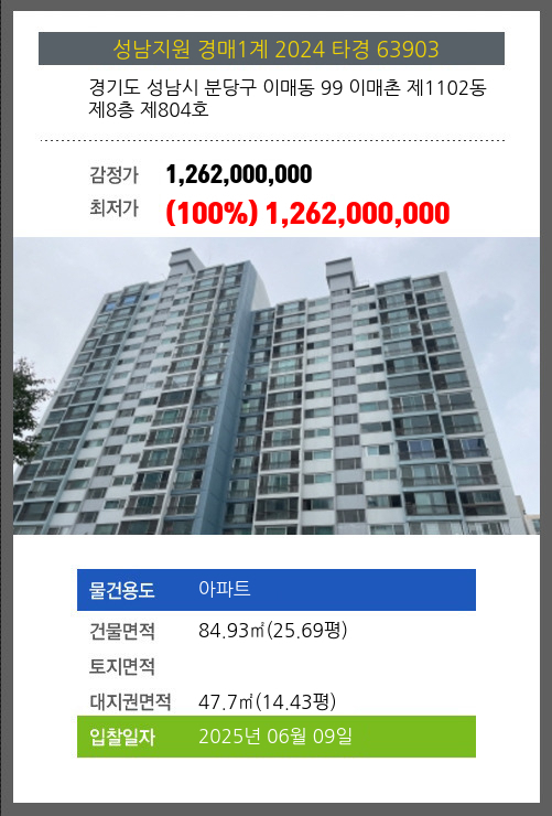 사건번호 2024 타경 63903 본건은 경기도 성남시 분당구 이매동 99 이매촌 제1102동 제8층 제804호소재하는 아파트경매 물건의 포스팅입니다. 건물면적 [ 84.93㎡ (25.69평) ]대지권 [ 47.7㎡ (14.43평)