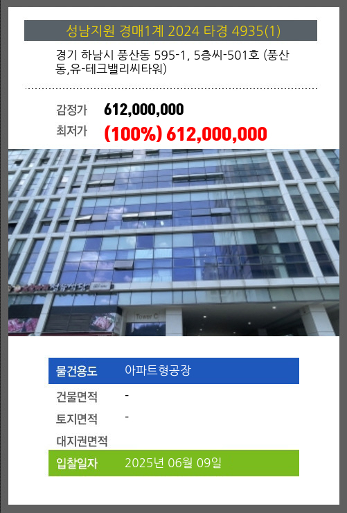 사건번호 2024 타경 4935(1) 본건은 경기 하남시 풍산동 595-1, 5층씨-501호 (풍산동,유-테크밸리씨타워)소재하는 아파트형공장경매 물건의 포스팅입니다. 시세를 반영한 감정가 612,000,000에서신건으로 감정가 대비 100%최저가 612,000,000부터입찰에 참여할 수 있습니다.