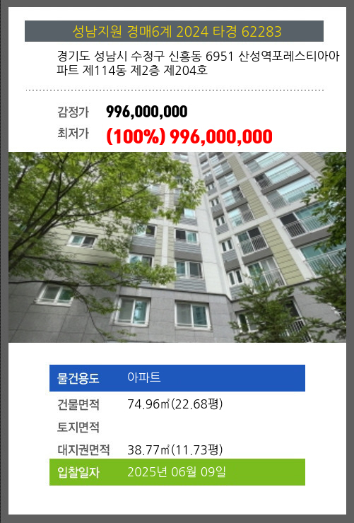 사건번호 2024 타경 62283 본건은 경기도 성남시 수정구 신흥동 6951 산성역포레스티아아파트 제114동 제2층 제204호소재하는 아파트경매 물건의 포스팅입니다. 건물면적 [ 74.96㎡ (22.68평) ]대지권 [ 38.77㎡ (11.73평)