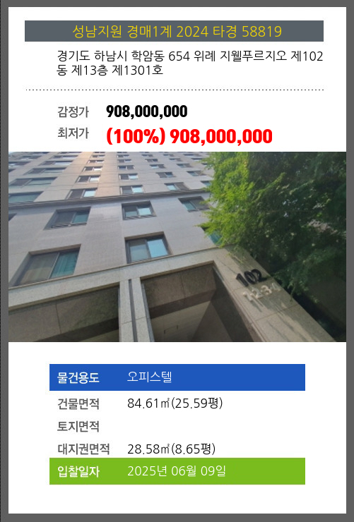 사건번호 2024 타경 58819 본건은 경기도 하남시 학암동 654 위례 지웰푸르지오 제102동 제13층 제1301호소재하는 오피스텔경매 물건의 포스팅입니다. 건물면적 [ 84.61㎡ (25.59평) ]대지권 [ 28.58㎡ (8.65평)