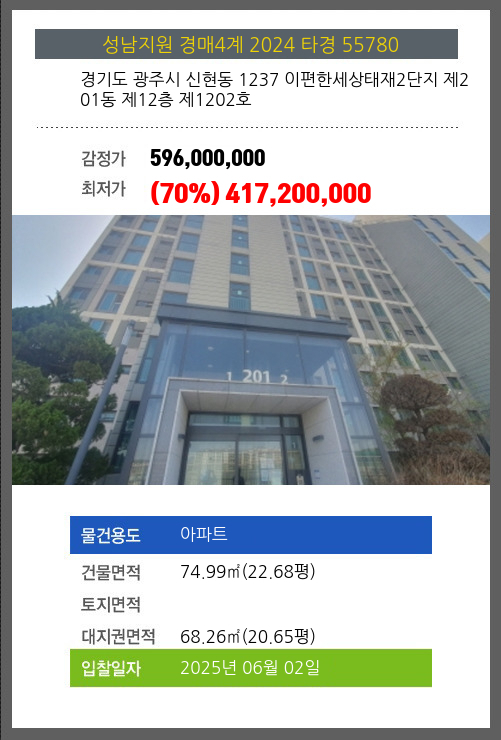 사건번호 2024 타경 55780 본건은 경기도 광주시 신현동 1237 이편한세상태재2단지 제201동 제12층 제1202호소재하는 아파트경매 물건의 포스팅입니다. 건물면적 [ 74.99㎡ (22.68평) ]대지권 [ 68.26㎡ (20.65평) ]