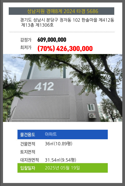 사건번호 2024 타경 5686 본건은 경기도 성남시 분당구 정자동 102 한솔마을 제412동 제13층 제1306호소재하는 아파트경매 물건의 포스팅입니다. 건물면적 [ 36㎡ (10.89평) ]대지권 [ 31.54㎡ (9.54평)