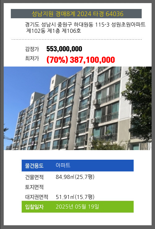 사건번호 2024 타경 64036 본건은 경기도 성남시 중원구 하대원동 115-3 성원초원아파트 제102동 제1층 제106호소재하는 아파트경매 물건의 포스팅입니다. 건물면적 [ 84.98㎡ (25.7평) ]대지권 [ 51.91㎡ (15.7평)
