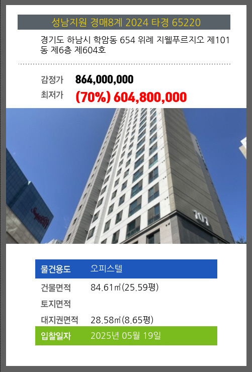 사건번호 2024 타경 65220 본건은 경기도 하남시 학암동 654 위례 지웰푸르지오 제101동 제6층 제604호소재하는 오피스텔경매 물건의 포스팅입니다. 건물면적 [ 84.61㎡ (25.59평) ]대지권 [ 28.58㎡ (8.65평)