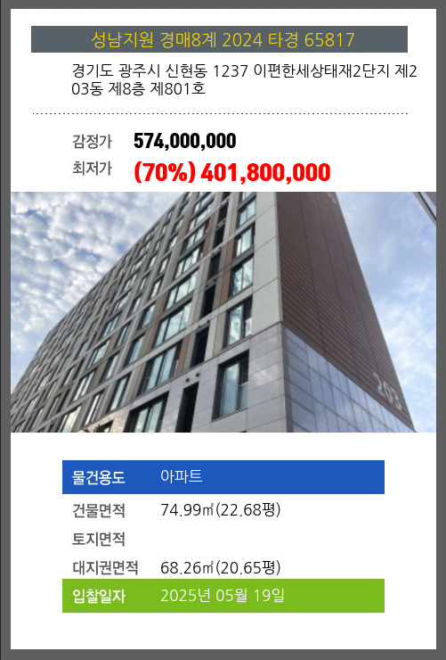 사건번호 2024 타경 65817 본건은 경기도 광주시 신현동 1237 이편한세상태재2단지 제203동 제8층 제801호소재하는 아파트경매 물건의 포스팅입니다. 건물면적 [ 74.99㎡ (22.68평) ]대지권 [ 68.26㎡ (20.65평) ]