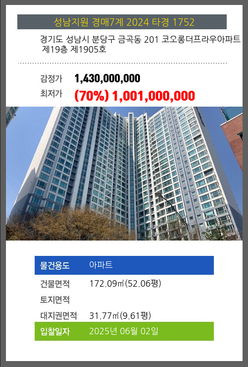 사건번호 2024 타경 1752 본건은 경기도 성남시 분당구 금곡동 201 코오롱더프라우아파트 제19층 제1905호소재하는 아파트경매 물건의 포스팅입니다. 건물면적 [ 172.09㎡ (52.06평) ]대지권 [ 31.77㎡ (9.61평) ]