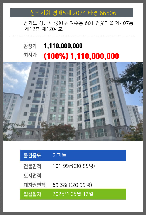 사건번호 2024 타경 66506 본건은 경기도 성남시 중원구 여수동 601 연꽃마을 제407동 제12층 제1204호소재하는 아파트경매 물건의 포스팅입니다. 건물면적 [ 101.99㎡ (30.85평) ]대지권 [ 69.38㎡ (20.99평)