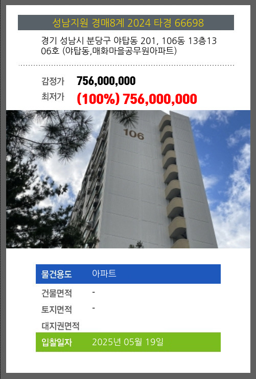사건번호 2024 타경 66698 본건은 경기 성남시 분당구 야탑동 201, 106동 13층1306호 (야탑동,매화마을공무원아파트)소재하는 아파트경매 물건의 포스팅입니다. 시세를 반영한 감정가 756,000,000에서신건으로 감정가 대비 100%최저가 756,000,000부터입찰에 참여할