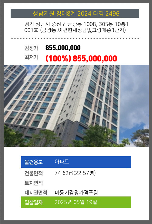 사건번호 2024 타경 2496 본건은 경기 성남시 중원구 금광동 1008, 305동 10층1001호 (금광동,이편한세상금빛그랑메종3단지)소재하는 아파트경매 물건의 포스팅입니다. 건물면적 [ 74.62㎡ (22.57평) ]대지권 [ 미등기감정가격포함 ] 시세를