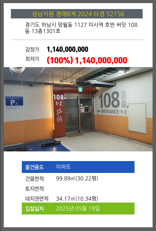 사건번호 2024 타경 52156 본건은 경기도 하남시 망월동 1127 미사역 호반 써밋 108동 13층1301호소재하는 아파트경매 물건의 포스팅입니다. 건물면적 [ 99.89㎡ (30.22평) ]대지권 [ 34.17㎡ (10.34평)