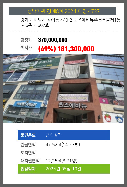 사건번호 2024 타경 4737 본건은 경기도 하남시 감이동 440-2 퀸즈에비뉴주건축물제1동 제6층 제607호소재하는 근린상가경매 물건의 포스팅입니다. 건물면적 [ 47.52㎡ (14.37평) ]대지권 [ 12.25㎡ (3.71평) ] 시세를