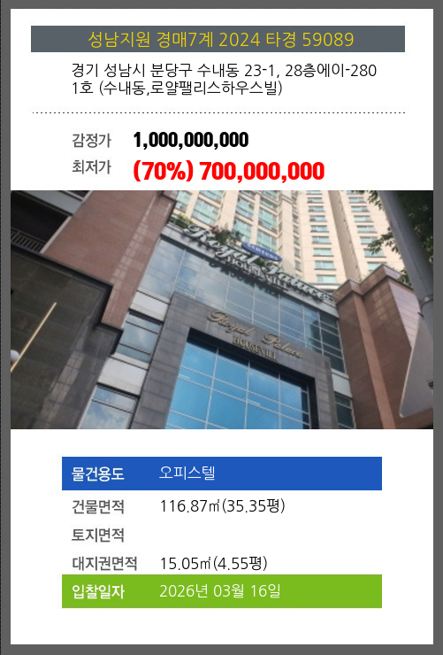 사건번호 2024 타경 59089 본건은 경기 성남시 분당구 수내동 23-1, 28층에이-2801호 (수내동,로얄팰리스하우스빌)소재하는 오피스텔경매 물건의 포스팅입니다. 건물면적 [ 116.87㎡ (35.35평) ]대지권 [ 15.05㎡ (4.55평) ] 시세를