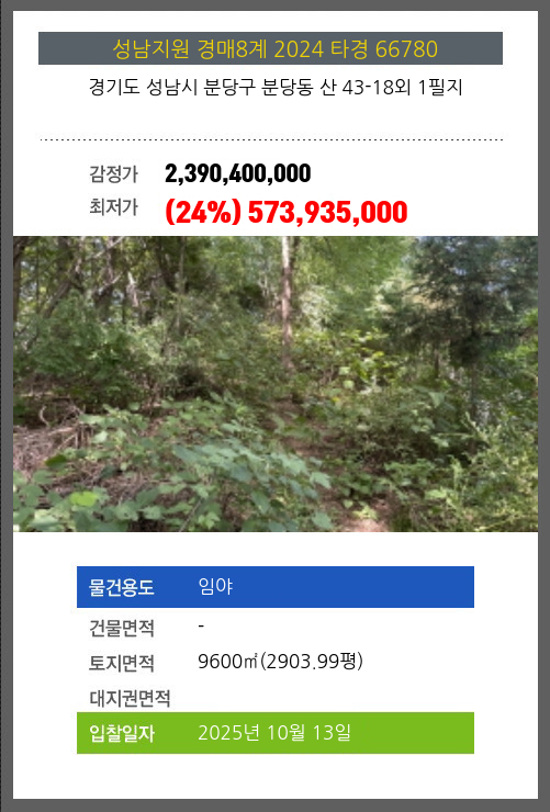 사건번호 2024 타경 66780 본건은 경기도 성남시 분당구 분당동 산 43-18외 1필지소재하는 임야경매 물건의 포스팅입니다. 토지면적 [ 9600㎡ (2903.99평) ] 시세를 반영한 감정가 2,390,400,000에서4회 유찰되어