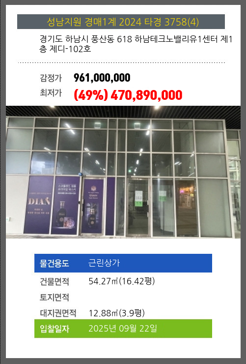 사건번호 2024 타경 3758(4) 본건은 경기도 하남시 풍산동 618 하남테크노밸리유1센터 제1층 제디-102호소재하는 근린상가경매 물건의 포스팅입니다. 건물면적 [ 54.27㎡ (16.42평) ]대지권 [ 12.88㎡ (3.9평) ] 시세를