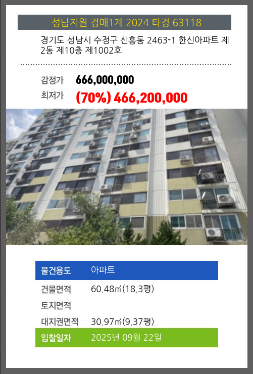 사건번호 2024 타경 63118 본건은 경기도 성남시 수정구 신흥동 2463-1 한신아파트 제2동 제10층 제1002호소재하는 아파트경매 물건의 포스팅입니다. 건물면적 [ 60.48㎡ (18.3평) ]대지권 [ 30.97㎡ (9.37평)
