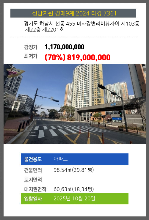 사건번호 2024 타경 7361 본건은 경기도 하남시 선동 455 미사강변리버뷰자이 제103동 제22층 제2201호소재하는 아파트경매 물건의 포스팅입니다. 건물면적 [ 98.54㎡ (29.81평) ]대지권 [ 60.63㎡ (18.34평) ]