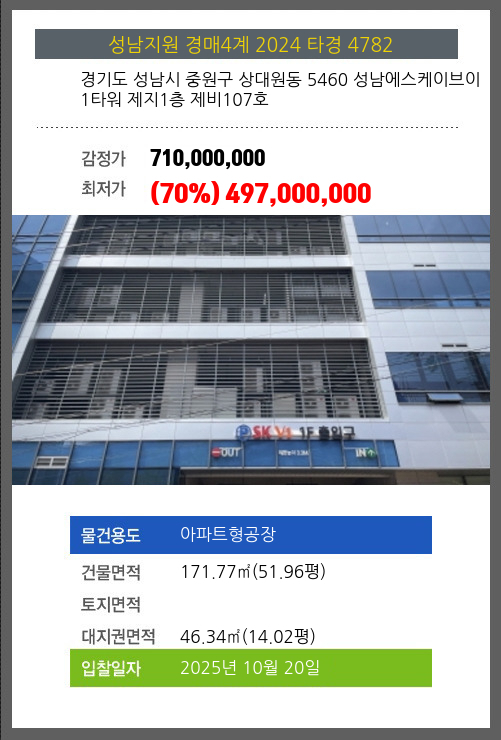 사건번호 2024 타경 4782 본건은 경기도 성남시 중원구 상대원동 5460 성남에스케이브이1타워 제지1층 제비107호소재하는 아파트형공장경매 물건의 포스팅입니다. 건물면적 [ 171.77㎡ (51.96평) ]대지권 [ 46.34㎡ (14.02평) ]