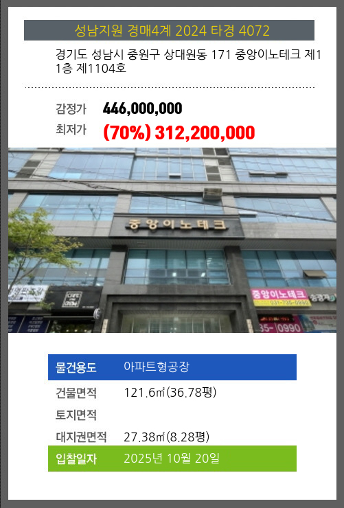사건번호 2024 타경 4072 본건은 경기도 성남시 중원구 상대원동 171 중앙이노테크 제11층 제1104호소재하는 아파트형공장경매 물건의 포스팅입니다. 건물면적 [ 121.6㎡ (36.78평) ]대지권 [ 27.38㎡ (8.28평) ]