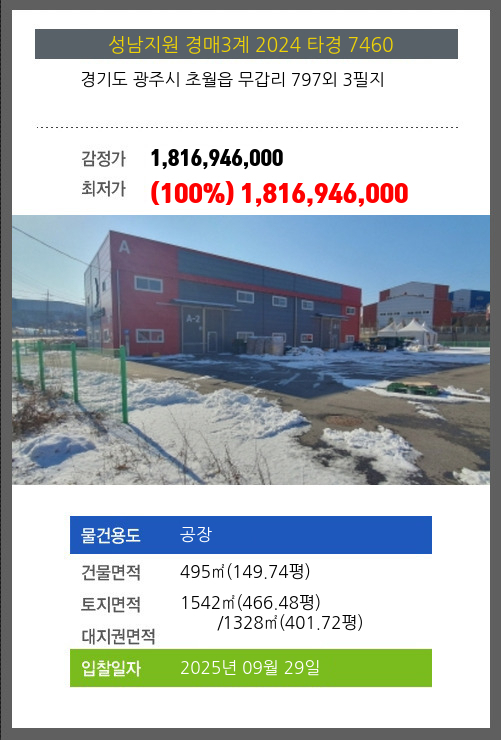 사건번호 2024 타경 7460 본건은 경기도 광주시 초월읍 무갑리 797외 3필지소재하는 공장경매 물건의 포스팅입니다. 건물면적 [ 495㎡ (149.74평) ]토지면적 [ 전체:1542㎡ (466.48평) 매각지분:1328㎡ (401.72평) ]