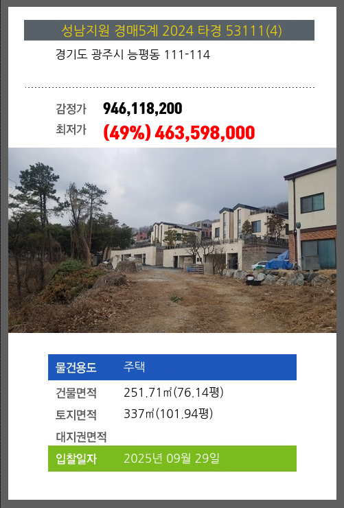 사건번호 2024 타경 53111(4) 본건은 경기도 광주시 능평동 111-114소재하는 주택경매 물건의 포스팅입니다. 건물면적 [ 251.71㎡ (76.14평) ]토지면적 [ 337㎡ (101.94평) ] 시세를 반영한 감정가 946,118,200에서2회