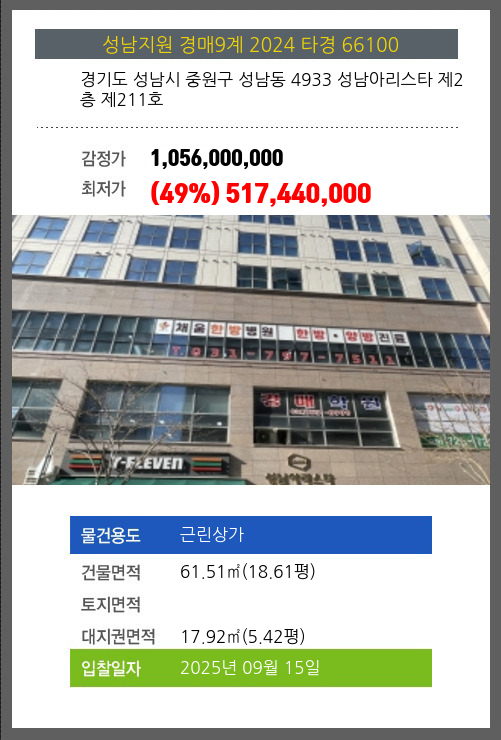 사건번호 2024 타경 66100 본건은 경기도 성남시 중원구 성남동 4933 성남아리스타 제2층 제211호소재하는 근린상가경매 물건의 포스팅입니다. 건물면적 [ 61.51㎡ (18.61평) ]대지권 [ 17.92㎡ (5.42평) ]