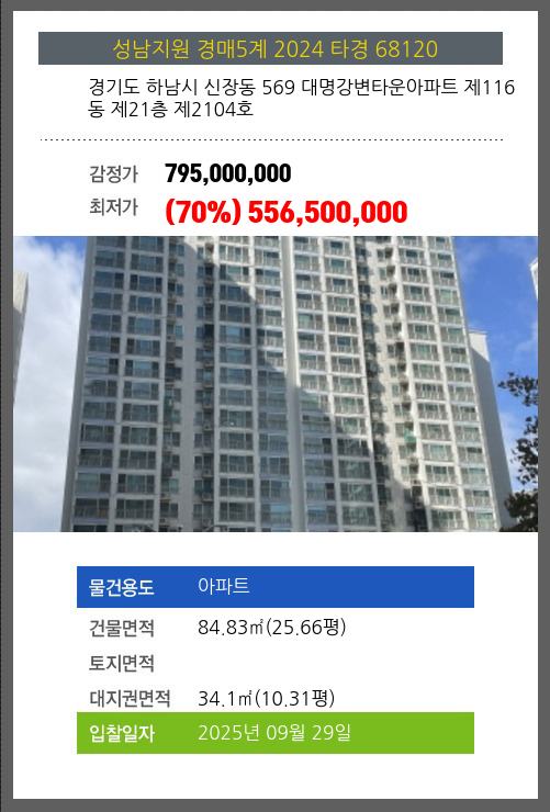 사건번호 2024 타경 68120 본건은 경기도 하남시 신장동 569 대명강변타운아파트 제116동 제21층 제2104호소재하는 아파트경매 물건의 포스팅입니다. 건물면적 [ 84.83㎡ (25.66평) ]대지권 [ 34.1㎡ (10.31평) ]