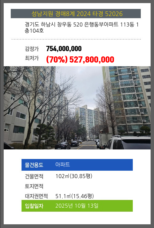 사건번호 2024 타경 52026 본건은 경기도 하남시 창우동 520 은행동부아파트 113동 1층104호소재하는 아파트경매 물건의 포스팅입니다. 건물면적 [ 102㎡ (30.85평) ]대지권 [ 51.1㎡ (15.46평) ] 시세를
